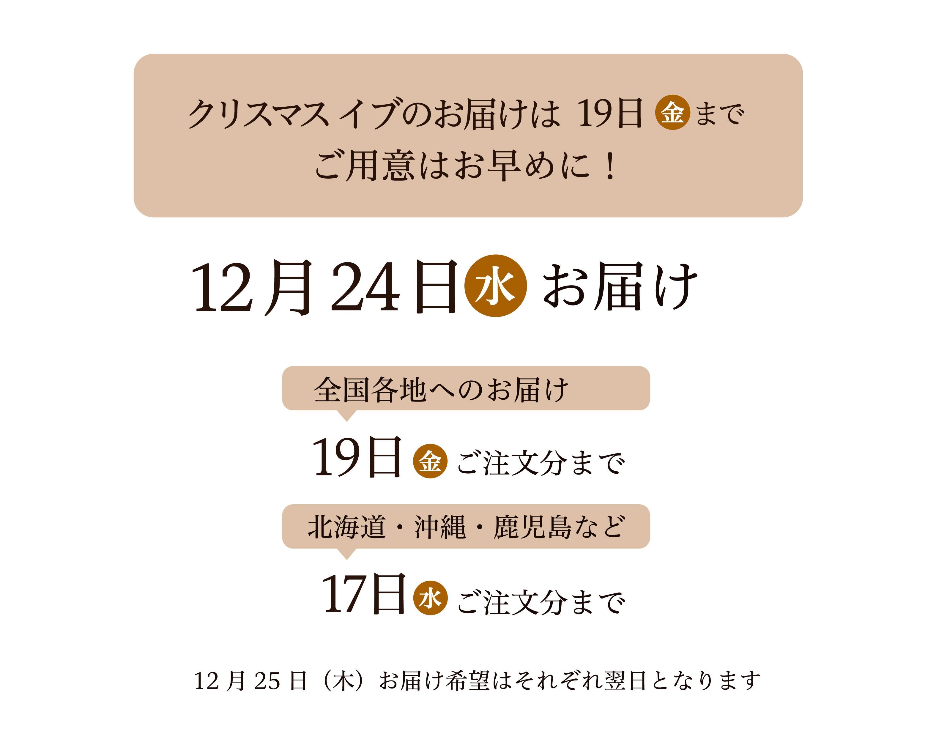 ・クリスマスイブ12月24日(水)までのお届けは12月19日(金)までにご購入ください(北海道・沖縄・鹿児島は17日まで)
