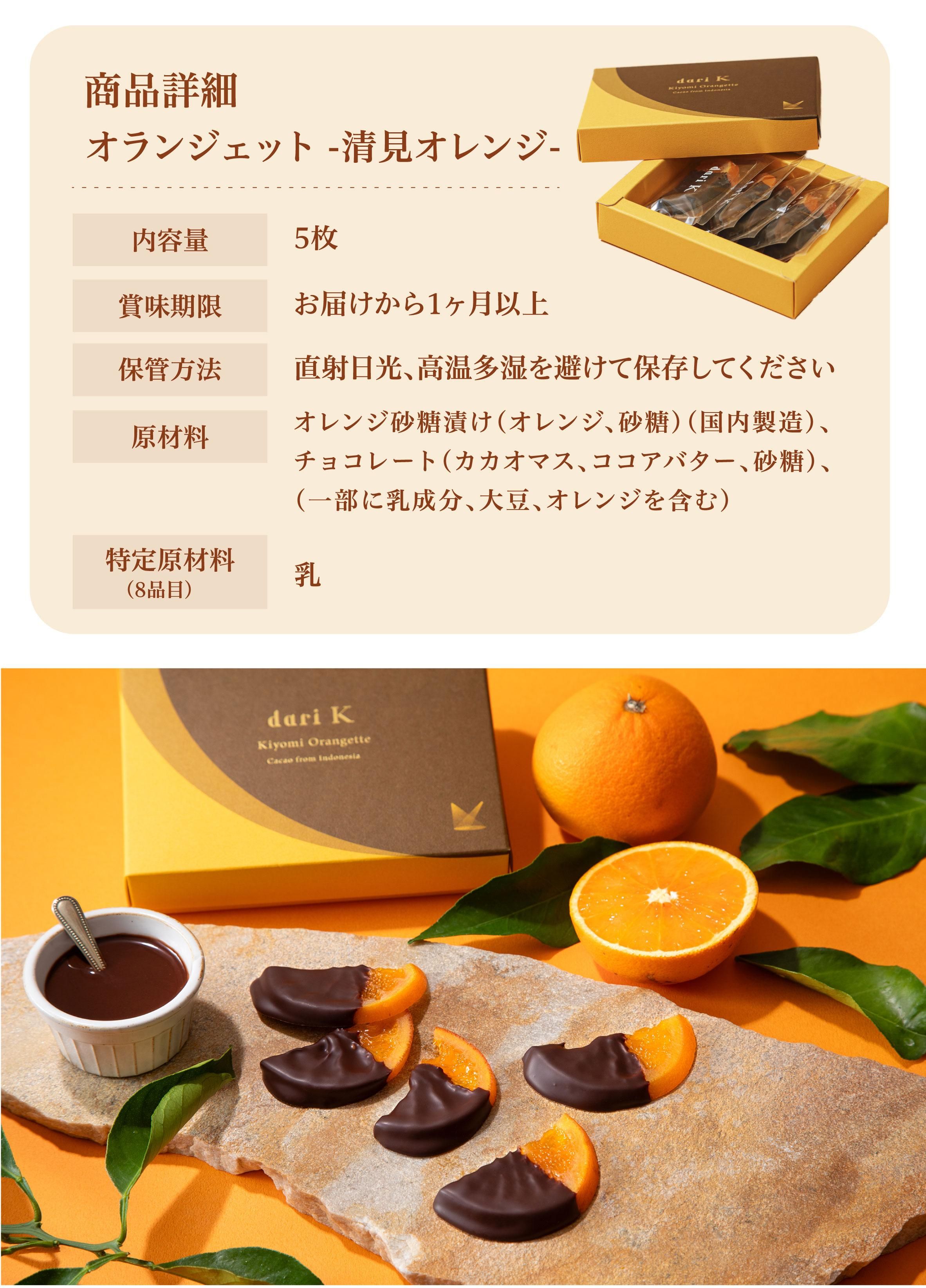 原材料:オレンジ砂糖漬け(オレンジ、砂糖)(国内製造)、チョコレート(カカオマス、砂糖、ココアバター)、(一部に乳成分・大豆・オレンジを含む)