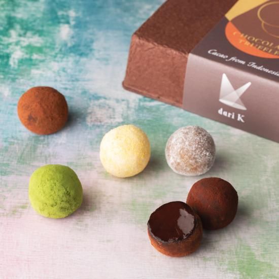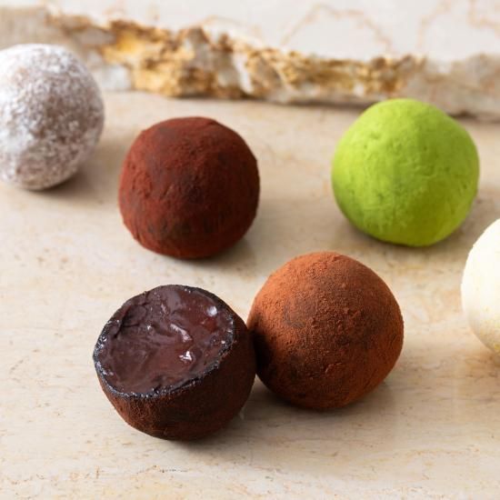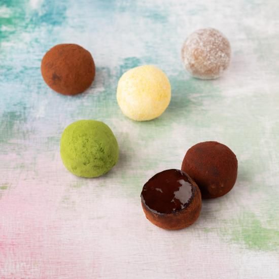 クラシック、ラトゥ、カシューホワイト、抹茶、フランボワーズ、コーヒーが各1粒ずつ。色とりどりのトリュフは、目を引く贈り物にもぴったり。公式オンラインショップでのみお求めいただける特別なトリュフセット。